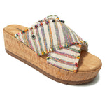 Elevate your summer style with the Minnetonka Posey Women's Sandals, a perfect blend of fashion and comfort. These slip-on sandals feature a chic frayed crossband design on a fabric upper, adding a touch of boho elegance to any outfit. The 2.25" heel height on a wedge bottom offers just the right amount of lift, making them versatile enough for both casual outings and dressier occasions. The cork wrap midsole and foam EVA midsole ensure that each step is cushioned, providing all-day comfort.