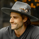 The standout feature of the Apache is its stunning hat band, crafted from leather and adorned with silver studs. The band also showcases a striking turquoise stone buckle, adding a pop of color and elegance. To top it all off, a feather is delicately placed, giving the hat a finishing touch that exudes sophistication.
