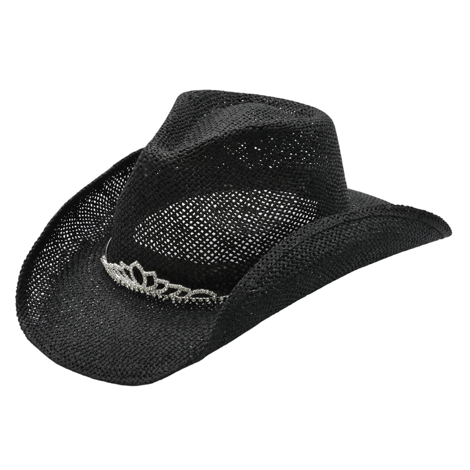 The Peter Grimm Jewel hat blends classic Western charm with an eye-catching touch of sparkle. Crafted from 100% Toyo straw, it features a pinchfront crown and a 3 1/4" brim that frames the face beautifully while offering just the right amount of sun protection. The tiara hat band adds a subtle shine, giving this style a hint of glamour that stands out effortlessly.