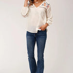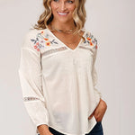 This women's cream peasant blouse from the Studio West Collection Summer I offers a breezy, lightweight fit perfect for warm-weather wear. Crafted from 100% cotton voile, the fabric is soft, breathable, and comfortable for all-day wear.