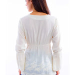 Add a touch of elegance to your wardrobe with the Scully Cantina Blouse, made from 100% Peruvian cotton for a soft, luxurious feel. This blouse features a flattering elastic empire waist, beautifully complemented by long bell sleeves that add an ethereal touch. The intricate scallop design on the "V" neckline, hemline, and cuffs enhances its romantic appeal, making it a standout piece.