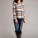 The Stetson Women’s Fall III "Desert Serape" Blouse offers a modern take on a timeless Western-inspired style. Made from soft and lightweight rayon twill, this blouse provides breathable comfort and a beautiful drape that flatters the figure. The open notch collar with a V-neckline creates a relaxed yet elegant look, perfect for both casual outings and slightly dressier occasions.