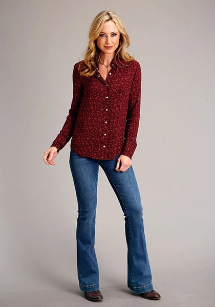 This Stetson Women’s Fall II "Wine Western Ditzy" Blouse is crafted from soft 100% rayon twill, offering a lightweight and breathable feel with a touch of Western charm. The single point deep curved front and back yokes add subtle structure, while the left chest patch pocket provides functional detail.