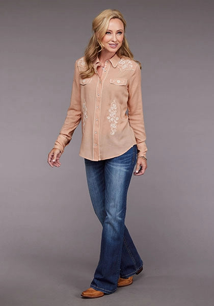 This Stetson Women’s Blush Blouse is made from soft, lightweight rayon flatweave, offering a breathable feel and a flattering drape. Its retro Western-style snap front and single point curved yokes combine classic cowboy-inspired details with a modern, relaxed silhouette. Cream piping and embroidery provide subtle, elegant accents that highlight the blouse’s design without overpowering it.