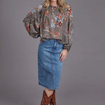 Designed with long sleeves gathered below triangle yokes and elastic cuffs, this blouse combines classic Western-inspired styling with a bohemian peasant aesthetic. The intricate "Vintage Tapestry" print makes it a versatile statement piece, perfect for layering or wearing on its own for casual or dressy occasions.