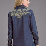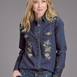 This Stetson Women’s Dark Blue Blouse is crafted from a soft, breathable blend of TENCEL and rayon, giving it a luxurious drape and lightweight feel. The single point curved front and back yokes provide classic Western structure, while the faux pocket flaps add a subtle, stylish accent. Embroidery details bring an elegant, handcrafted touch to the design.