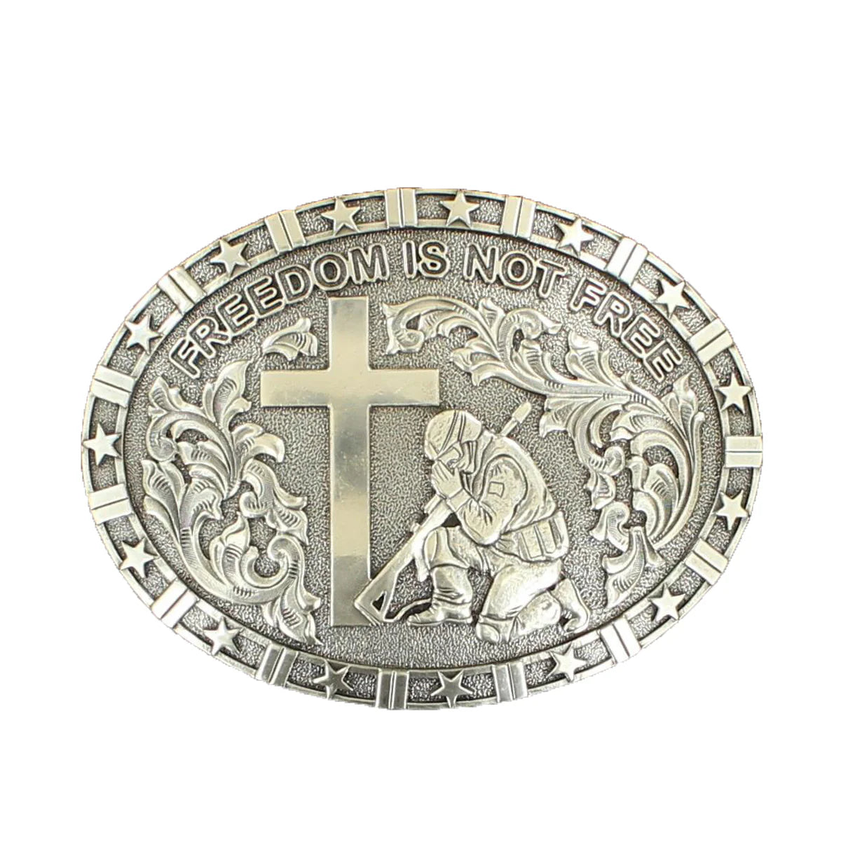 This buckle from M&F Western Products is a striking tribute to courage, faith, and sacrifice. Crafted with a detailed scrolling pattern background, it features a kneeling soldier before a cross at the center, symbolizing honor and remembrance for those who have served. The words “Freedom Is Not Free” are beautifully displayed, reminding us of the bravery and devotion behind every sacrifice.