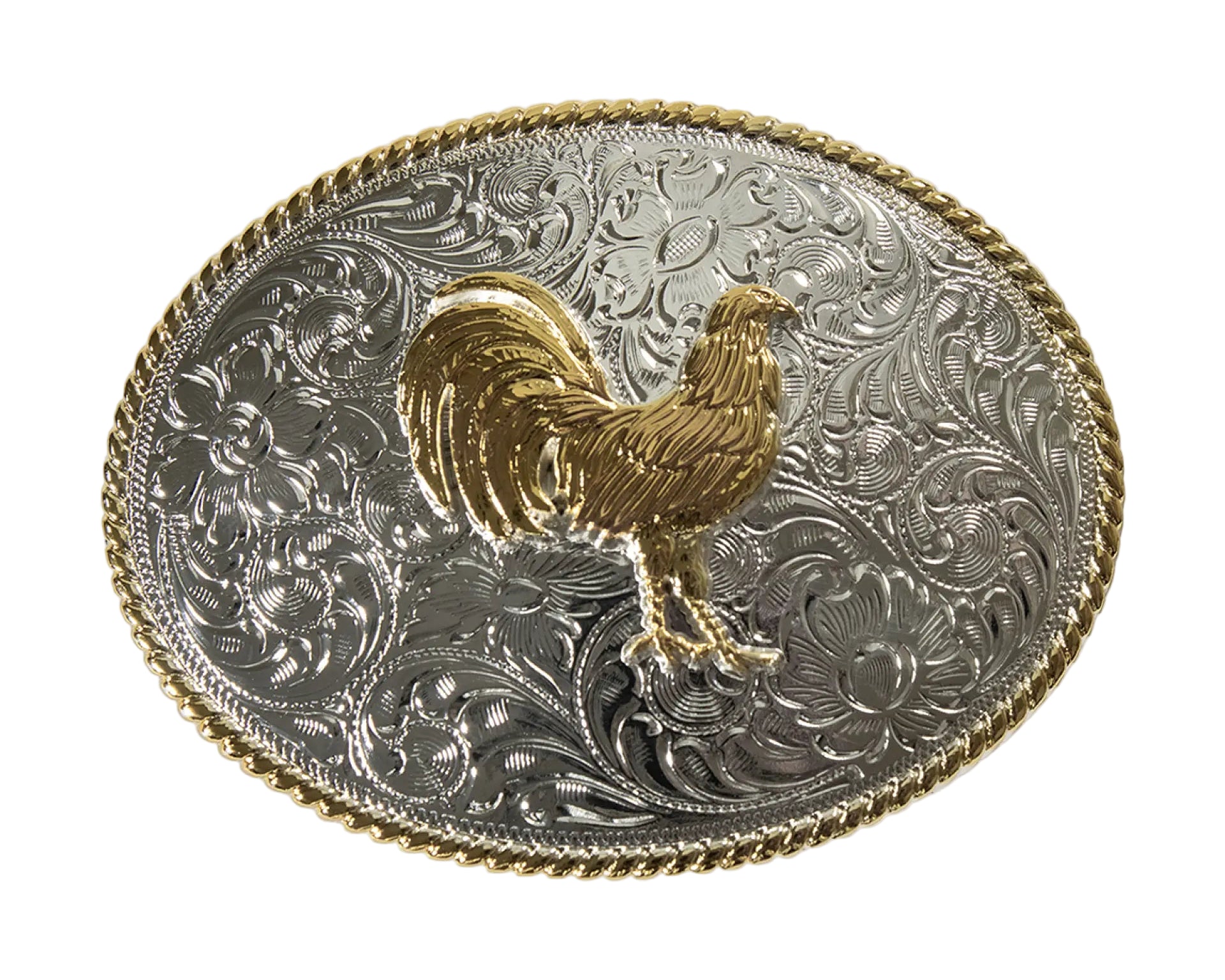 This Nocona belt buckle showcases a striking standing rooster motif set against a finely engraved scrolling pattern. Crafted from durable zinc and iron, it is designed to offer both longevity and classic Western appeal.