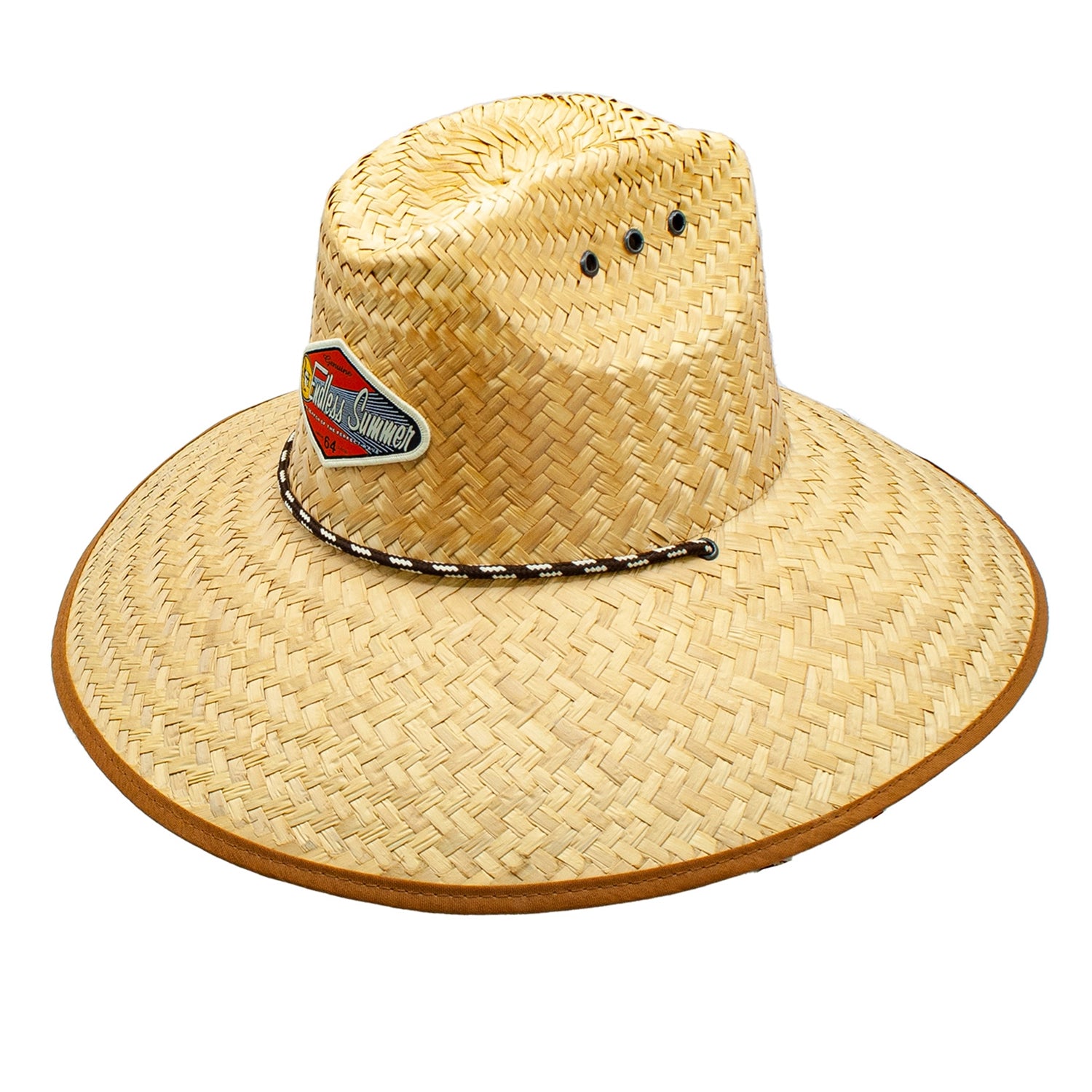The Peter Grimm Salt Creek Lifeguard hat blends timeless lifeguard design with modern sun protection, crafted from 100% straw and featuring metal rivet venting for enhanced breathability. The lifeguard crown and 4 1/2" brim provide excellent coverage, while the adjustable chin cord and Elasta-fit inner band ensure a secure and comfortable fit for all-day wear.
