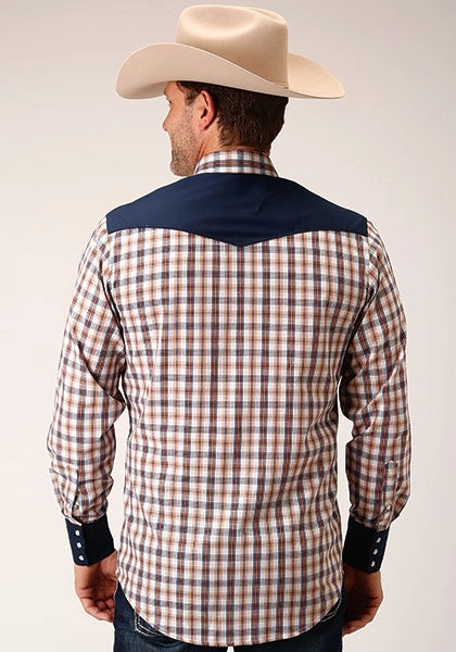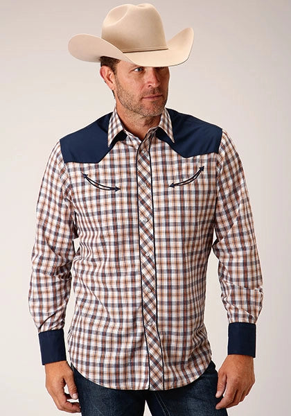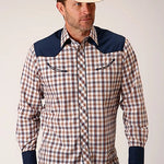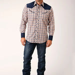 This Karman Special Styles western shirt features a striking navy, gold, and rust windowpane plaid on a durable cotton/poly blend, offering a soft and comfortable fit. The pieced body with solid contrast panels adds a tailored look, while the curved 1-point back yoke ensures ease of movement.