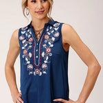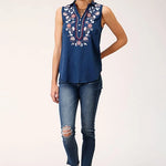 This elegant navy sleeveless blouse from the Studio West Spring I Collection is crafted from soft, flowing poly crepe. The colorful embroidery along the front and collar adds a vibrant, feminine touch, making it a perfect standout piece for casual or dressy western-inspired outfits.