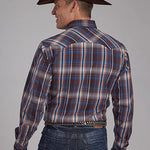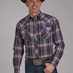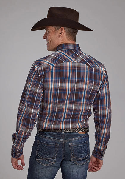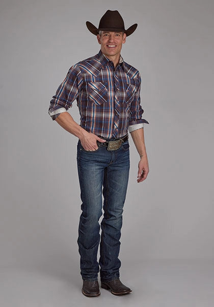 This men’s long sleeve western-style shirt from the West Made Collection features 100% cotton yarn-dyed plaid with dobby texture, combining visual interest with durability. The 1 point curved front yoke and 2 point curved back yoke deliver a classic western silhouette, while the curved pockets with flaps provide functional style and a clean finish. Solid tan poplin inside trim adds a subtle contrast for a polished look.
