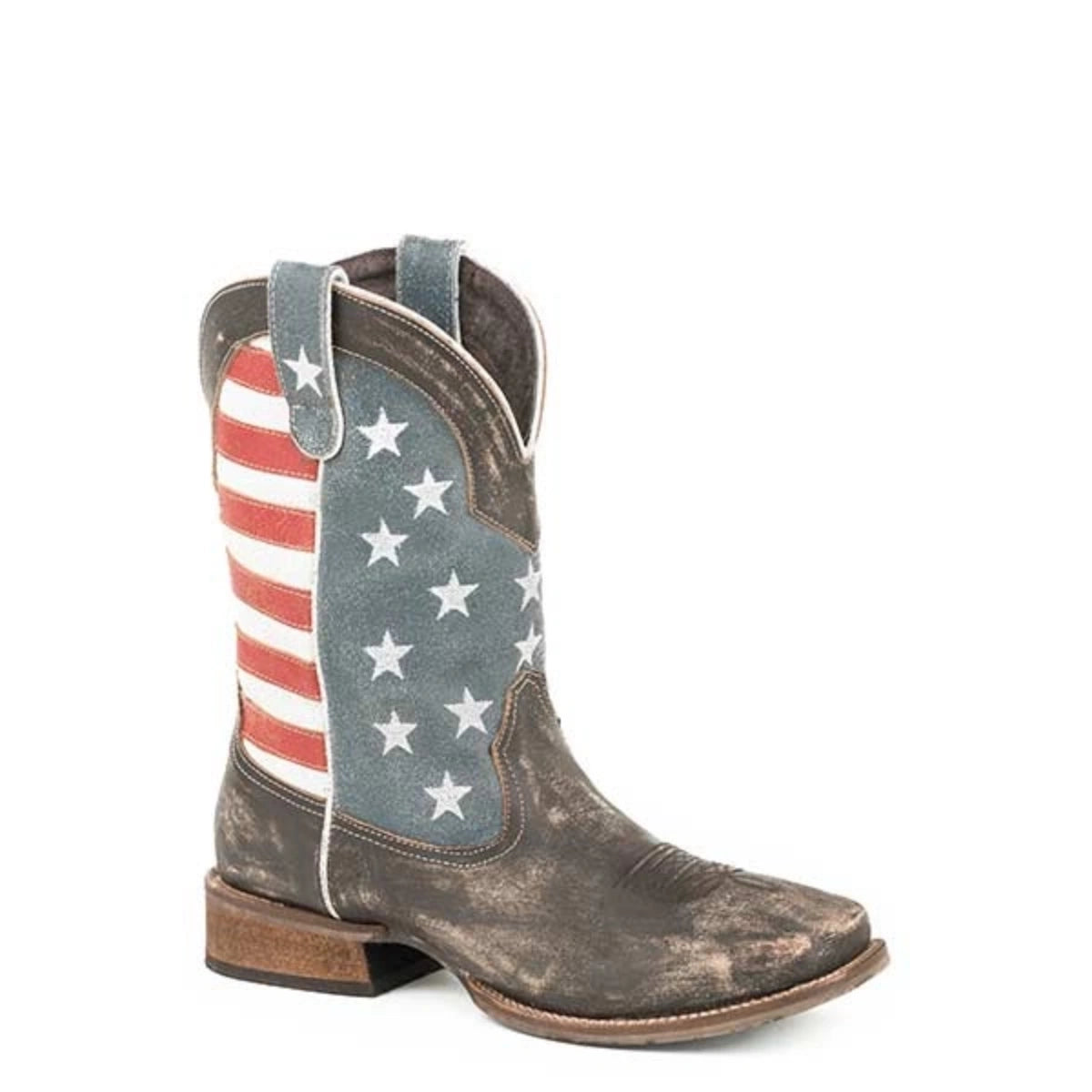 The America boot proudly blends Western tradition with patriotic spirit. The distressed brown leather vamp pairs perfectly with the bold American flag shaft, giving this boot a standout look that honors classic craftsmanship and national pride. A square toe and 12" shaft make it a versatile option for both everyday wear and special occasions.