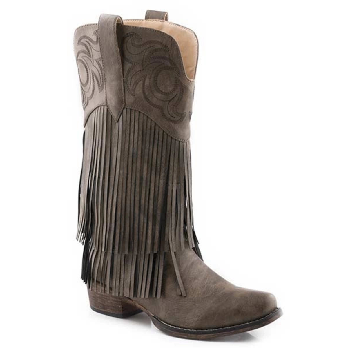Rickrack in brown smooth faux leather showcases a bold western-inspired fringe boot with a 13" shaft, combining classic style with contemporary flair. The snip toe fashion bottom enhances its modern appeal, making it a versatile choice for both casual and statement-making outfits.
