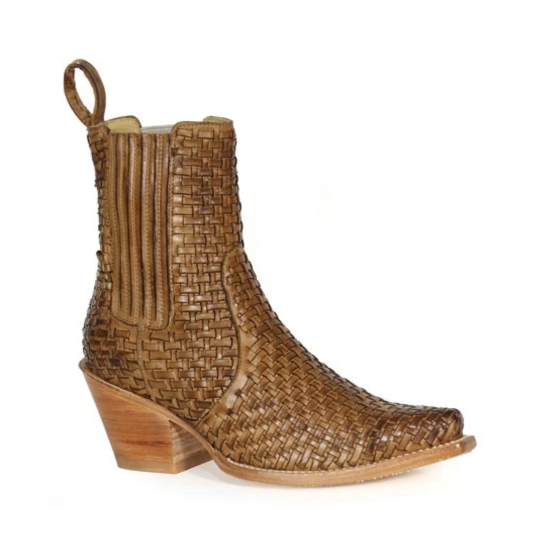 The Abby is a handcrafted cowboy boot that showcases timeless Western artistry. With a rich brown vamp and 7-inch shaft covered in a striking basket weave design, it delivers a bold yet classic look. A snip toe and stacked heel enhance its traditional silhouette, making it a versatile choice for both everyday wear and special occasions.