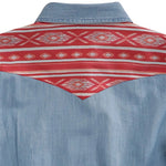 The Tin Haul Women’s Denim Shirt brings a bold Western edge to a timeless classic. Crafted from soft, durable cotton, this shirt features curved front and back yokes pieced with a colorful Aztec print for a vibrant contrast that stands out. The cream pearl snap front and snap cuffs add that authentic Western flair, while the curved pockets and flap details elevate the look with style and practicality.