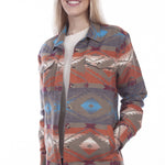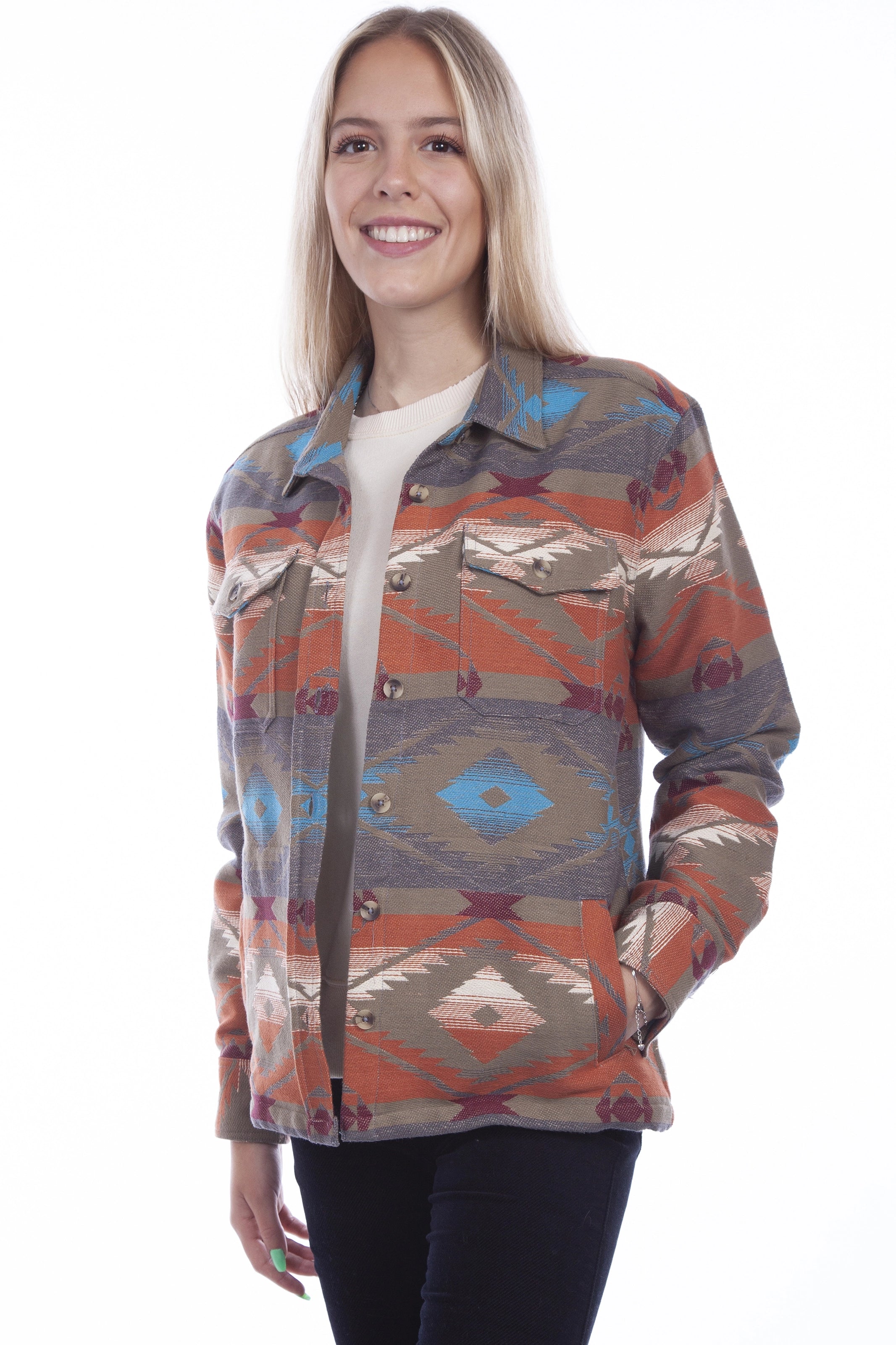 The vibrant Aztec pattern adds eye-catching character, while the button front, point collar, and chest flap pockets keep the design grounded in classic Western styling. Easy to wear on its own or layered over a tee, this shirt jacket offers standout style with practical comfort for changing seasons.