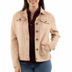 This Honey Creek Soft Sunshine women's jean jacket delivers a fresh take on a classic denim-inspired silhouette, crafted from a soft microfiber fabric that offers comfort with a polished look. The structured shape, contrast stitching, and traditional button front give it a familiar Western feel while keeping the fit lightweight and easy to wear.