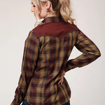 This long sleeve western shirt features a warm caramel and grey plaid pattern, offering a classic Western look with a modern twist. The fancy front yokes with applique add stylish detailing, while the curved back yoke enhances comfort and fit. Pieced and piped solid broadcloth accents provide subtle contrast and structure to the shirt.
