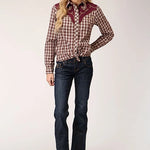 This long sleeve western shirt showcases a rich wine, cream, and tan small-scale plaid pattern for a timeless Western-inspired look. The fancy front yoke with applique adds a touch of elegance, while the curved back yoke ensures a comfortable, flattering fit. Pieced and piped solid broadcloth accents highlight the shirt’s design and structure.