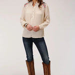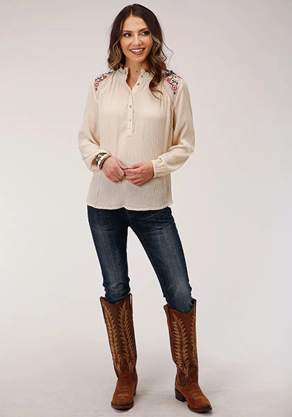 This charming blouse from the Studio West Fall II Collection is crafted from lightweight crinkle rayon that drapes beautifully for a soft, romantic look. The ruffled stand collar and floral embroidery on the shoulders add a touch of delicate femininity, while the half button placket gives it a classic, vintage-inspired appeal.