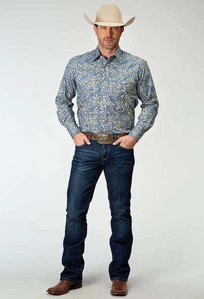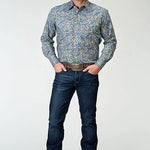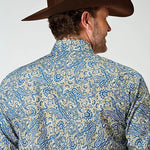This Amarillo Western Blues Long Sleeve Shirt is crafted from 100% cotton for a soft, breathable feel and features a classic delft paisley print that adds a bold western flair. Designed with a snap front and 3 snap cuffs, it offers easy wear while maintaining a crisp, tailored appearance.