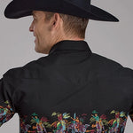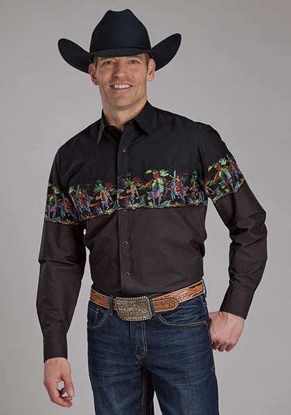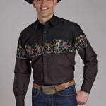 This men’s long sleeve shirt from the Roper Vintage Collection showcases a playful scribble bullriders border print, perfect for adding western character to your wardrobe. The scenic border design on 100% cotton poplin gives it a timeless, vintage feel, while the spread collar and welt pockets with flaps offer classic western styling.
