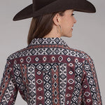 This women’s long sleeve vertical performance Y/D stripe shirt from the West Made Collection showcases a striking Winter Aztec print on soft, breathable 100% cotton. The garment-washed finish gives it a comfortably broken-in feel while enhancing the vibrant design.