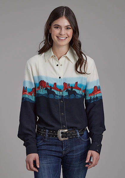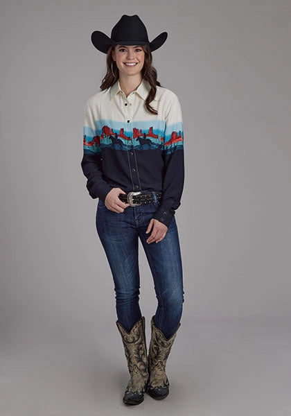 This long sleeve blouse from the Five Star Collection - Fall II features a striking western border print that brings a timeless, rustic charm to your wardrobe. Crafted from soft, lightweight rayon, it drapes beautifully for a flattering fit. The clean silhouette with no front or back yokes keeps the look simple yet stylish, letting the intricate border print take center stage.