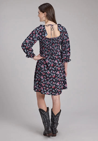 This playful Bronc Riders printed dress from the Five Star Winter II Collection is crafted from soft, breathable rayon for a comfortable fit. The shirred bodice and ruffle detail at the neckline create a flattering silhouette, while the 3/4 sleeves with elastic ruffle cuffs add a delicate, feminine touch.