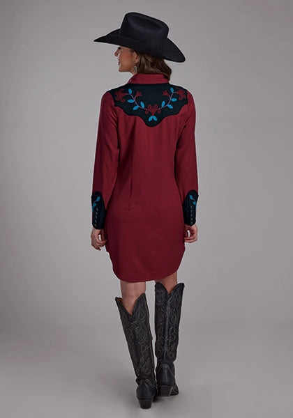 This elegant dress from the Old West Collection is crafted from a comfortable polyester/spandex twill blend, providing both stretch and structure for a flattering fit. Floral embroidery decorates the front and back yokes and cuffs, adding intricate western-inspired detail, while the faux smile pocket features embroidered arrow points for a unique touch.