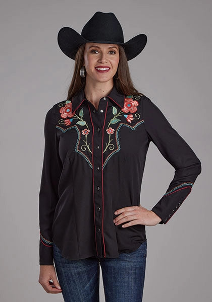 This women’s long sleeve western-style shirt from the Old West Collection combines classic western charm with a comfortable stretch fit. The poly/spandex twill fabric ensures ease of movement, while the detailed floral embroidery on both front and back adds a touch of elegant western flair.