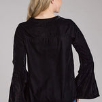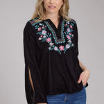 Featuring colorful embroidery across the front bodice, a split-V placket with a black pearl button, and split bell long sleeves, this blouse offers a feminine and vintage-inspired silhouette. The curved hem enhances the flowy design, making it ideal for pairing with jeans, skirts, or dressy trousers for a chic, polished look.