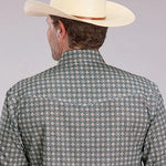 Featuring a one-point curved front yoke into the neck, a one-point back yoke, and one-point flaps with matching pockets, this shirt showcases a striking medallion foulard pattern. Roper "R" embroidery adds an extra touch of western detail, making it perfect for casual outings, rodeos, or any event where classic western style is desired.