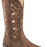 The Bailey boot blends vintage charm with classic Western details, featuring a brown faux leather upper adorned with intricate floral embroidery on the shaft. Its square toe and stockman heel create a timeless silhouette that pairs beautifully with both casual and dressy looks.