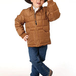 This brown puffer coat is made for a young cowboy ready to take on cold weather with style and grit. Its poly fill keeps him warm without weighing him down, while the rib-knit collar and cuffs help seal in the warmth. The window-pane quilting gives it a rugged, classic look, and the front and back yokes add a western touch he’ll love. With big cargo pockets, there’s plenty of room for his treasures or to keep his hands toasty.