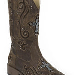 The Faith boot shines with a perfect blend of Western heritage and sparkling detail. Crafted from vintage brown faux leather, it features a wide square toe that balances rugged charm with a comfortable fit. The crystal cross bling and underlay on the shaft and vamp add a touch of elegance, making this boot a standout choice for any occasion.