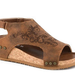 The Josie Laser sandal features a vintage cognac faux leather upper with an intricate western laser design for a standout look. Its open toe silhouette and secure back strap make it easy to wear while adding a touch of western flair.
