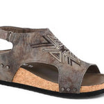The Josie sandal showcases a vintage grey faux leather upper adorned with a detailed Aztec embroidery design, giving it a distinctive southwestern-inspired style. The open toe and secure back strap make it comfortable and easy to wear for all-day outings.