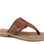 The Juliet sandal showcases a beautifully painted tooled leather upper, adding a touch of artisan craftsmanship to your summer wardrobe. Its rich brown tones and intricate tooling make it a standout piece for casual outings or dressier occasions.