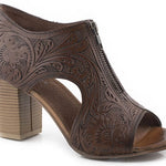 The Mika Front Zip sandal is designed for those who love a bold statement piece with a touch of Western artistry. Featuring a burnished brown tooled leather design, this open toe style blends classic hand-tooled craftsmanship with modern appeal. The closed back and front center zip not only add a fashionable edge but also make slipping these sandals on and off effortless.