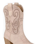 Miranda is a chic western-inspired boot crafted from beige suede faux leather, featuring a striking western design that adorns the 8" shaft for a classic cowboy boot look. Its narrow round toe provides a refined silhouette, perfect for pairing with both casual and western-style outfits.