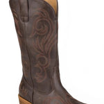 Riley is styled in brown vintage faux leather that delivers a bold and timeless Western look. The 12" shaft, paired with detailed embroidery on both the vamp and shaft, creates a boot that stands out with authentic cowboy charm. The snip toe silhouette enhances its classic appeal, making it a versatile choice for a wide range of outfits.