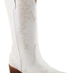 Riley Scroll features a white smooth faux leather upper adorned with intricate all-over embroidery, creating a standout western-inspired design. The 12" shaft adds height and presence, making this boot both stylish and functional for everyday wear or special occasions.