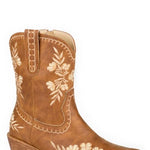 Wynona is a chic boot crafted from tan vintage faux leather, featuring a delicate floral design across the shaft and vamp for a stylish, western-inspired look. The snip toe adds a modern, flattering shape while keeping the overall design classic and versatile.