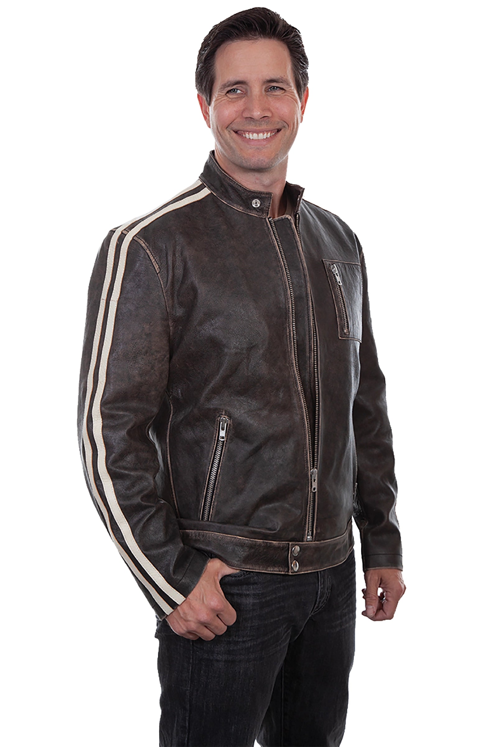 The Scully 992 Racer Leather Jacket blends classic racing style with the rugged feel of sanded calf leather. Bold sleeve stripes give it an unmistakable motorsport look, while the zip front with snap closures at the collar and waist creates a secure, clean silhouette. Its zip cuffs and sharp paneling enhance the overall streamlined aesthetic.