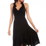 Featuring an asymmetrical hemline that falls below the knees, this dress adds a playful twist to a classic silhouette, making it ideal for both casual outings and special occasions. The ruffled detailing adds a feminine flair, while the flowing design ensures easy movement. For convenience, the dress is machine washable in cold water and is best hung to dry, keeping it fresh and ready for your next adventure. The Scully Cantina Halter Top Dress is the perfect choice for those who appreciate effortless elegance and unique style.