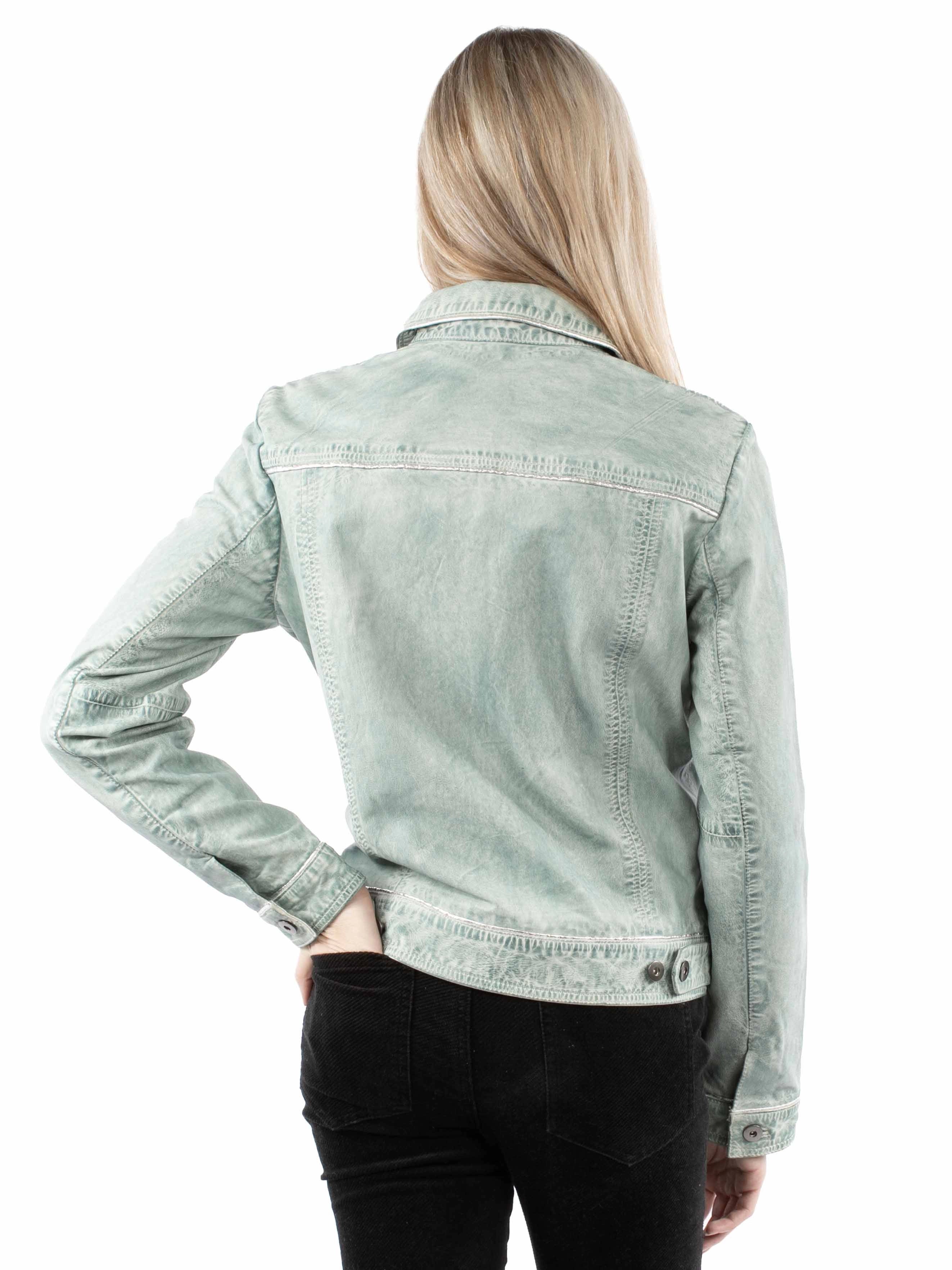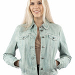 The Scully Denim Lamb Women's Jean Jacket offers a luxurious take on a classic western denim jacket. Made from soft lamb skin leather, this jacket features a six-button front closure and a point collar for a timeless silhouette. Two chest flap pockets with button closures provide authentic western styling, while adjustable waist tabs allow for a tailored fit.