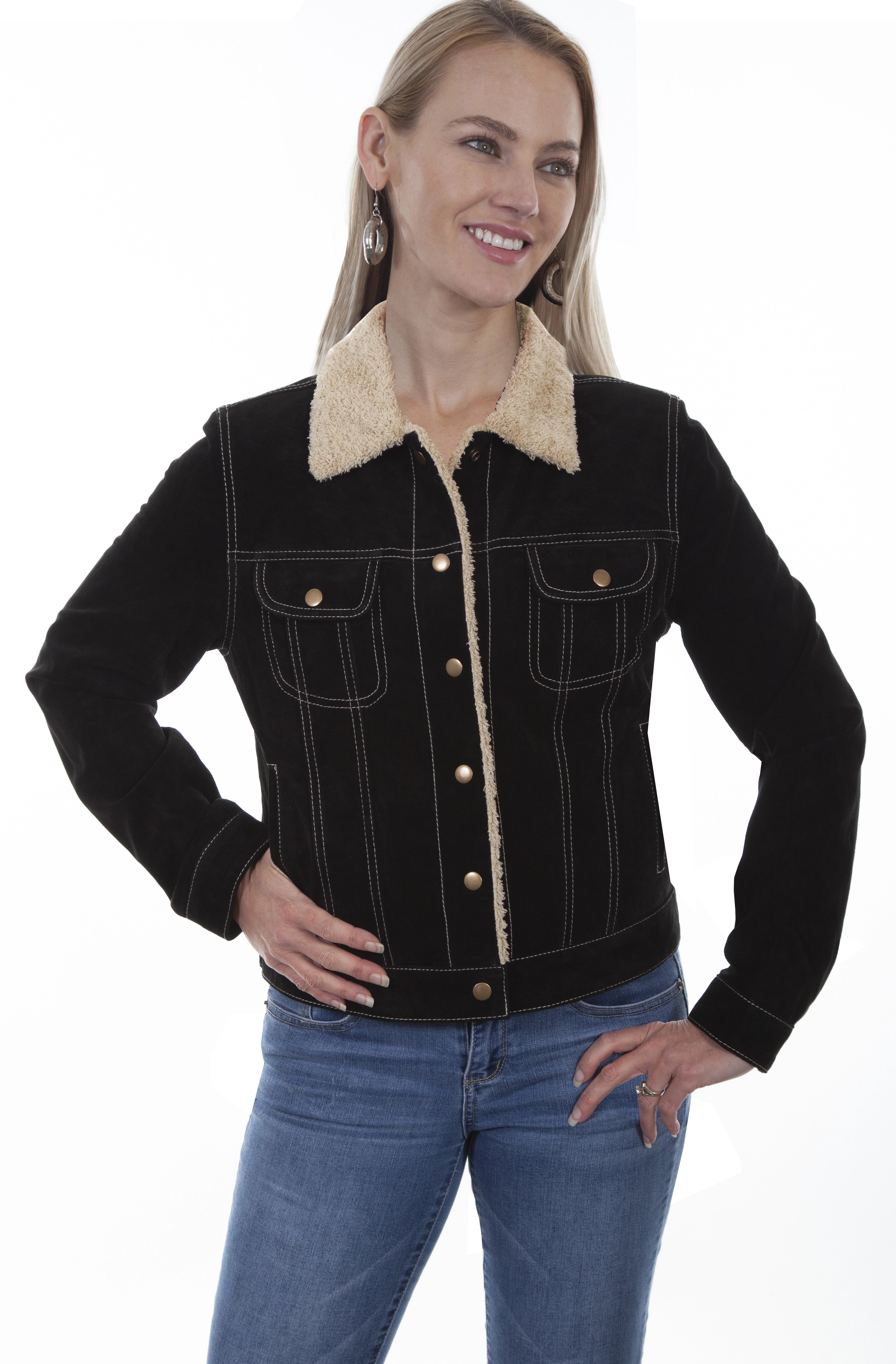 The Scully Shearling Suede Women's Jean Jacket combines classic western style with cozy comfort. Crafted from soft suede, it features a snap front closure and a faux shearling point collar that adds warmth and a timeless western touch. The faux shearling lining and inside suede pocket provide extra functionality while maintaining a chic look.