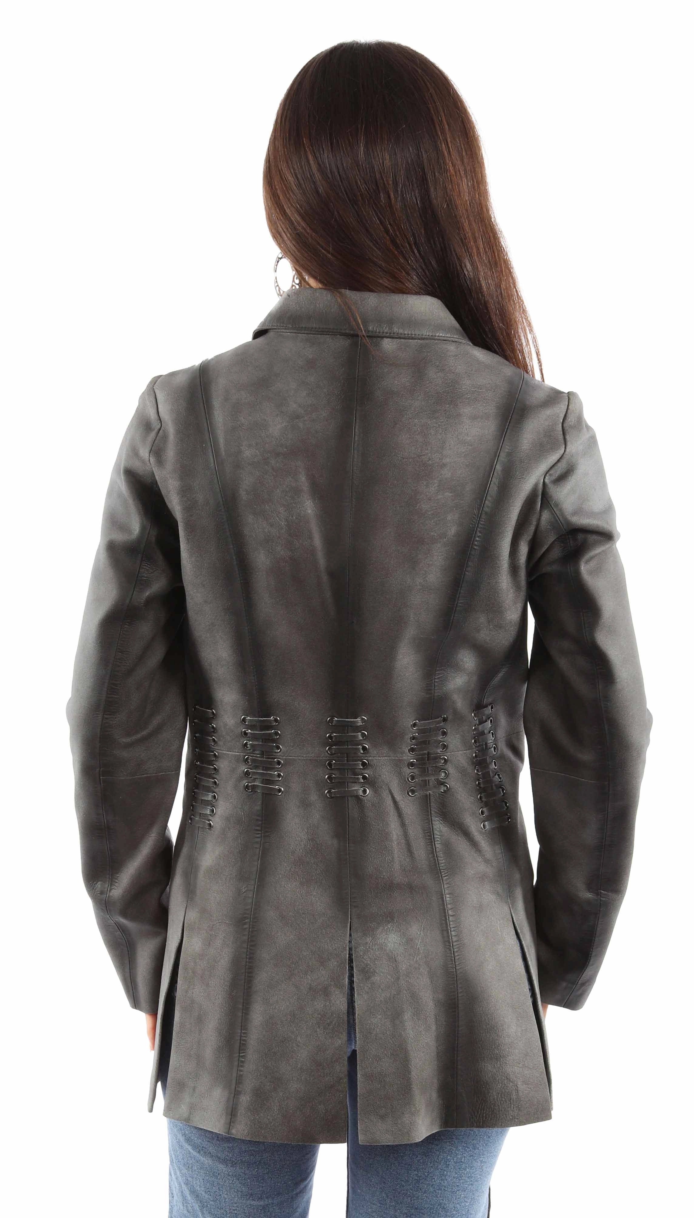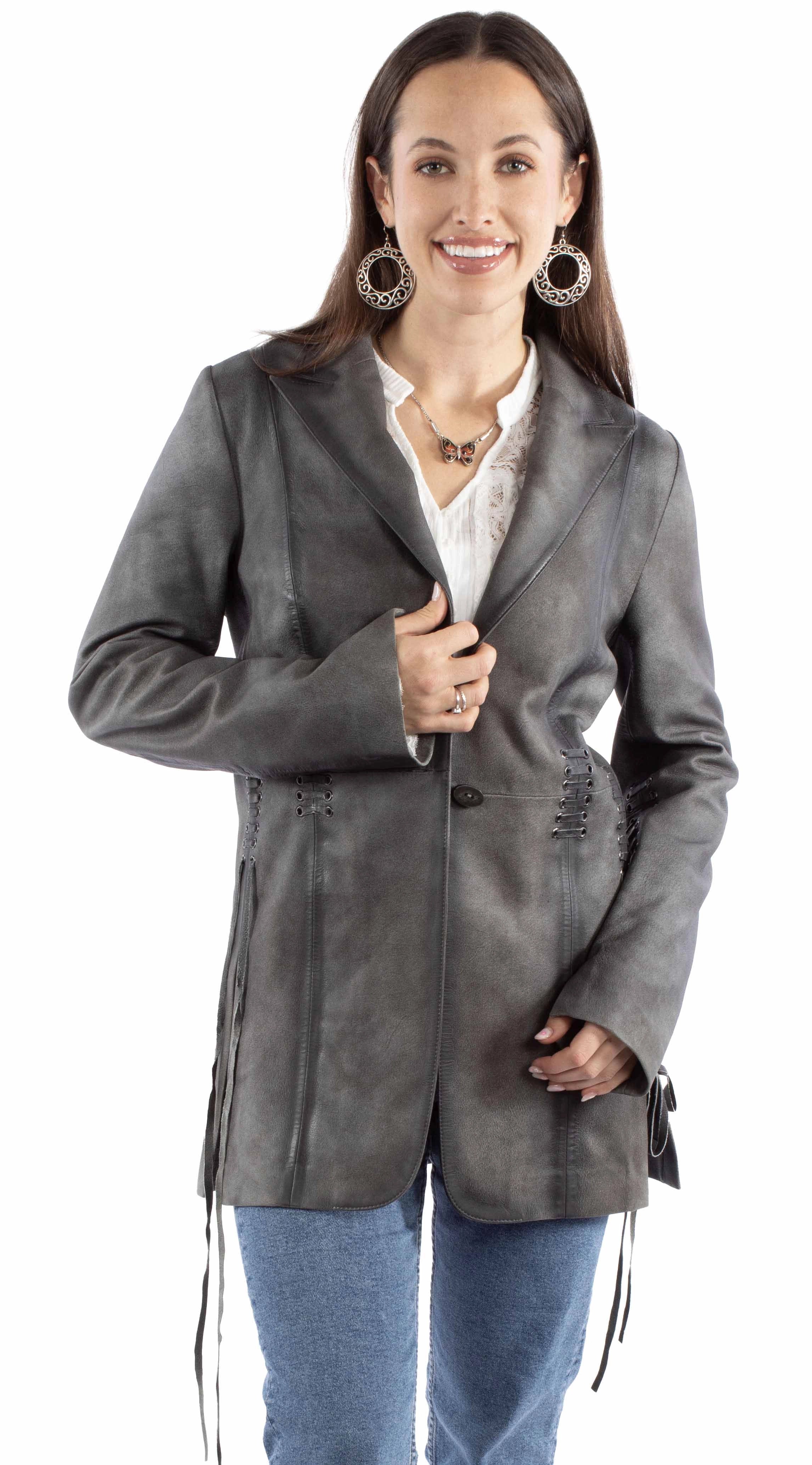 The Scully Vintage Lacing Women's Leather Jacket offers a sophisticated take on western-inspired outerwear. Its long-length design and classic button closures provide timeless elegance, while the delicate lacing on the waist and sleeves adds subtle detailing that elevates the jacket’s overall style.